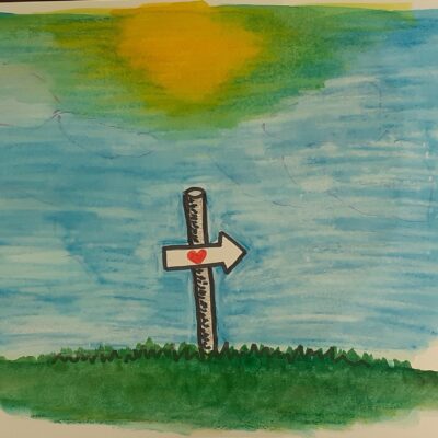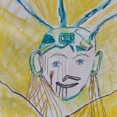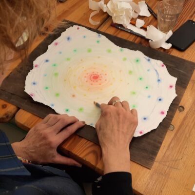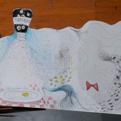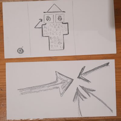 Na een half uur bekijken we het resultaat. Daarna wordt het menens en werkt iedereen zijn eigen idee uit. Stof tot denken dwarrelt neer op het papier.