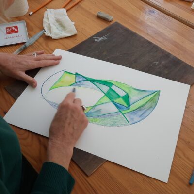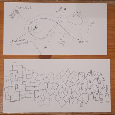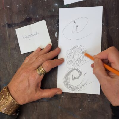 Met dat op het netvlies gaan de tekenaars aan het werk. Kleine briefjes met abstracte begrippen worden willekeurig uitgedeeld. In korte tijd maken ze een schets en dan wisselen ze de briefjes. Termen als kringloop, transformatie, systeem, perspectief en oorsprong doen de ronde.