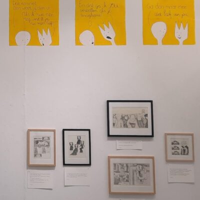 Joke van Leeuwen heeft de wanden van WG Kunst volgehangen met tekeningen en hier en daar een van haar favorieten op de muur geschilderd. Zo lijkt Iep door het raam naar buiten te vliegen en worden Vurkie en Lepeltjie in de Applemoesstraat verenigd met Deesje.