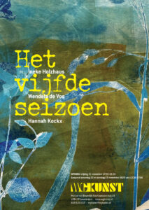 Van 21 t/m 23 november exposeren Ineke Holzhuis, Wendela de Vos en Hannah Kockx in WG Kunst onder de titel ‘Het vijfde seizoen’. Iedereen kan de vier seizoenen van het jaar herkennen; kleuren, vormen en geluiden zijn verbeeld en bezongen. Het vijfde seizoen is onbekend en juist dat schept ruimte voor nieuw werk.