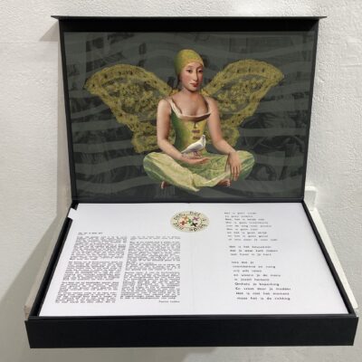 Ja, en dan deze doos zal ik het maar noemen. Het is het enige werk in deze expo wat een gedicht in zich draagt en een verhaal met woorden vertelt. Alleen om die reden al begerenswaard. Een lofzang op de schepping die niets voorschrijft, en niets afkeurt. En daarmee alle wegen open zet voor goed en kwaad. Maar wij zijn het die onze eigen keuzes moeten maken. We kunnen niet leunen op de ander.