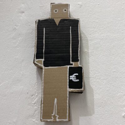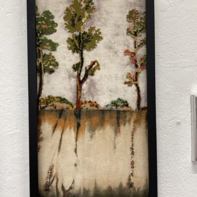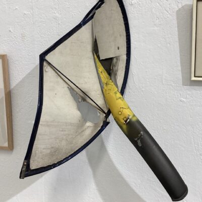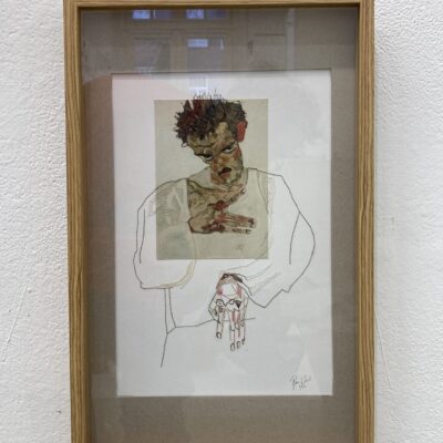 Er is zoveel wat ik eigenlijk nog zou moeten beschrijven in deze kunstbeurs. Teveel om op te noemen. De zwarte takken met een ragfijn bladscherm waarvan je niet begrijpt hoe ze zo onbeschadigd uit het maakproces tevoorschijn zijn gekomen. Het gebreide zeilbootje waar een paar takken de mast en boegspriet vormen. Egon Schiele die opeens in een zelfportret verschijnt, die kleurige wolkenlucht die zo levensecht oogt en zo zacht en wollig is dat je hem wilt aan raken, de vrouw die op haar bed ligt te roken en waar draden overheen lopen die de scene levendigheid geven, het mannetje van karton dat drie dimensionaal geworden is en lijfelijk oogt, dat haakwerk waarin de abstracte vormgeving uit de 20-tiger jaren zichtbaar wordt, dat kleurige stuk dik papier, zo uitgescheurd uit een groter vel, waarop outsider art is aangebracht, de gebreide bomen die zich spiegelen in het water, zelfs plastic leent zich om kunst te maken getuige een baby die stevig is ingepakt in dat materiaal, een bescheiden zuil van drie kleine blokjes waarop abstracte collages zijn aangebracht die kleurig een pleidooi houden voor de kracht van abstractie, een wonderlijk object waarbij een spatbord door een jasbeschermer boort, ijzerplaatjes van schroot die door hun rechthoekige vorm en een gele druppel verf erop ineens kunst zijn geworden.