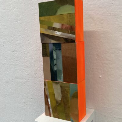 Een groot werk valt mij op. En een kleiner werk, ik denk van dezelfde kunstenaar. Het grote op doek en het kleine op een paneel. Het paneel oogt enigszins gebutst en doorleefd. Je ziet banen verf aangebracht die min of meer parallel over de plank lopen. Maar zeker niet nauwkeurig, integendeel. Bij elke kleur zie je door de verf heen andere kleuren tevoorschijn komen. Het geheel wordt er buitengewoon doorleefd en stoffelijk door. Alsof er al een heel leven achter de rug is op het houten schot. Materiekunst zou je het kunnen noemen. De klemtoon ligt op het stoffelijke. Maar de kleuren zijn net zo belangrijk bij haar. Inclusief de variaties in wit.