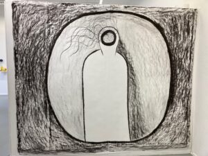 Een paar meter verderop tref ik de volgende kunstenaar. Deze keer een man die peinzend naar zijn kunstwerk staat te kijken. Alsof hij er nog verder aan wil werken maar even niet weet hoe nu verder te gaan. Ik spreek met hem. Over zijn aarzelingen. Het grote vel papier op de wand toont een mannelijk figuur. Er omheen zie je vegen van houtskool.