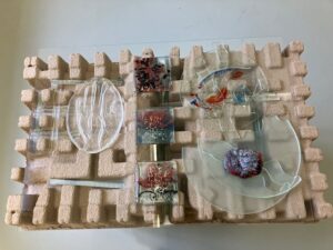 Ik kom in een hoek van de zaal waar ik allemaal kleurige kubusjes aan draden zie hangen. Alles van papier geknipt en gevouwen en geplakt. Een wonderlijk schouwspel. De kunstenaar vertelt dat het de ontwikkeling van de mens laat zien. Bovenin zie je vissen en dieren maar naarmate je lager komt worden het kubusjes. Van het organische leven zijn we terecht gekomen in het computer en internetgebeuren waarin we verleid worden tot steeds meer achter het scherm zitten. En waar je uiteindelijk niet beter van wordt.
