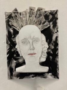 In een hoek van de achterzaal zie ik een installatie van papier gemaakt. Ik spreek de kunstenaar. Ze is Russisch van geboorte. Maar spreekt al aardig Nederlands. Ze vertelt dat de voorstelling – het beeldt een gezicht uit, of eigenlijk zijn het drie gezichten – laat zien hoe ze zich gevoeld heeft in haar land van herkomst. Overal heerste de dictatuur van het verplichte je “uitspreken zoals het moest.” De opvoeding die ze kreeg stond bol van eindeloos herhaalde politiek correcte uitspraken waar ze niets aan had. Die je alleen maar ongelukkiger maakten. Er was totaal geen aansluiting met hoe zij zelf dacht en voelde. Haar werk oogt ruimtelijk. Door de dwarsverbanden ontstaat er diepte in het werk. Het meest in het oog springend is het gezicht en face. Het kijkt de toeschouwer doordringend aan.