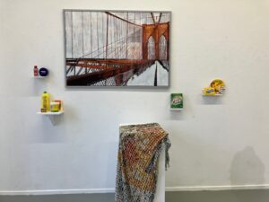 Even verderop raak ik in gesprek met een kunstenaar die staat te schilderen op een groot doek. Of is het wel een doek ? Het lijkt meer een houten plaat. Ook met haar raak ik aan de praat. Ze vertelt dat het een brug voorstelt. Maar dan een brug die nooit aan de overkant komt. Of liever, je ziet geen overkant. Haar werk is een kunstig bijeenvoegen van een foto en verf. Zodanig dat je niet eens de overgang van het een naar het ander ziet. Ze vertelt over bepaalde ervaringen die ze in haar leven heeft meegemaakt. In de woelige zeventiger jaren op reis naar New York. De hippie tijd. Opwinding maar ook treurigheid die je meemaakte en zag. Een periode die diepe indruk op haar heeft gemaakt. En die ze een beetje in deze brug tot uiting brengt.