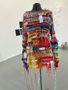 Op de laatste dag, vlak voor de opening, staat er opeens een paspop in de ruimte waarom heen een gehaakt vest hangt. Het laatste kunstwerk wat kennelijk net binnen is gebracht. Met prachtig woldraad in allerlei kleuren gemaakt. Op het vest zitten hier en daar stiksels waarop teksten staan te lezen. Teksten die verwijzen naar allerlei diagnoses. Sommigen uit een medisch handboek geplukt, anderen uit de rechtstreekse beleving van een patiënt.