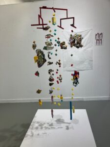 Een wonderlijke bouwsel van gekleurde plaatjes vormen een grote hanger waarin ook weer dieren terug keren. De bouwsels zijn prachtig terwijl de boodschap somber is. Ernaast op de wand ook weer veelkleurig papier wat echter hier en daar ingeknipt lijkt. Van dichterbij zie ik dat het niet is in geknipt maar verborgen geraakt onder een wit vel papier dat in hoeken is gesneden.
