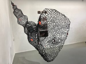 In de verste uithoek van de zaal zie ik papieren die aan touwen naar beneden hangen. Deels beschreven. Ik zie er in uitgedrukt hoe toevallig kunst eigenlijk tot stand komt. Zelf bedacht maar toch bij nader inzien verregaand beïnvloed door externe omstandigheden. Daarnaast aan de wand vellen papier waarop getekend is. Bij nader inzien blijkt het schuurpapier te zijn. Een teken hoe ze onze samenleving beleeft. Het is alsof ze processen in beeld wil brengen die uiteindelijk grotendeels vanzelf tot stand zijn gekomen. Voortgekomen uit het grotere wereldgebeuren. Het is bij uitstek een manier om het thema van deze tentoonstelling in beeld te brengen. “Zie hoe kunst ontstaat door gebeurtenissen in de wereld om mij heen. Omstandigheden waar ik maar gedeeltelijk de hand in heb. Die mij meer bepaald hebben dan ik hen.”