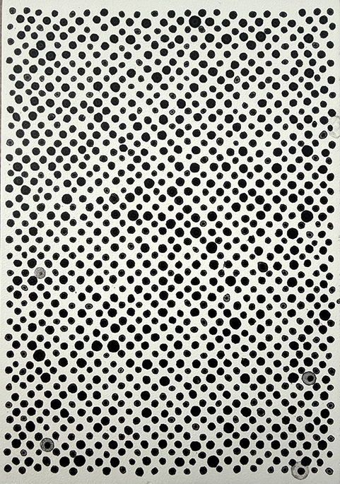 Met een dikke kwast probeer ik zo regelmatig mogelijk kleine stippen te zetten.