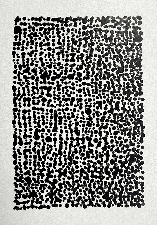 zwarte druppels verf op een witte achtergrond, gesigneerd aan de achterkant
