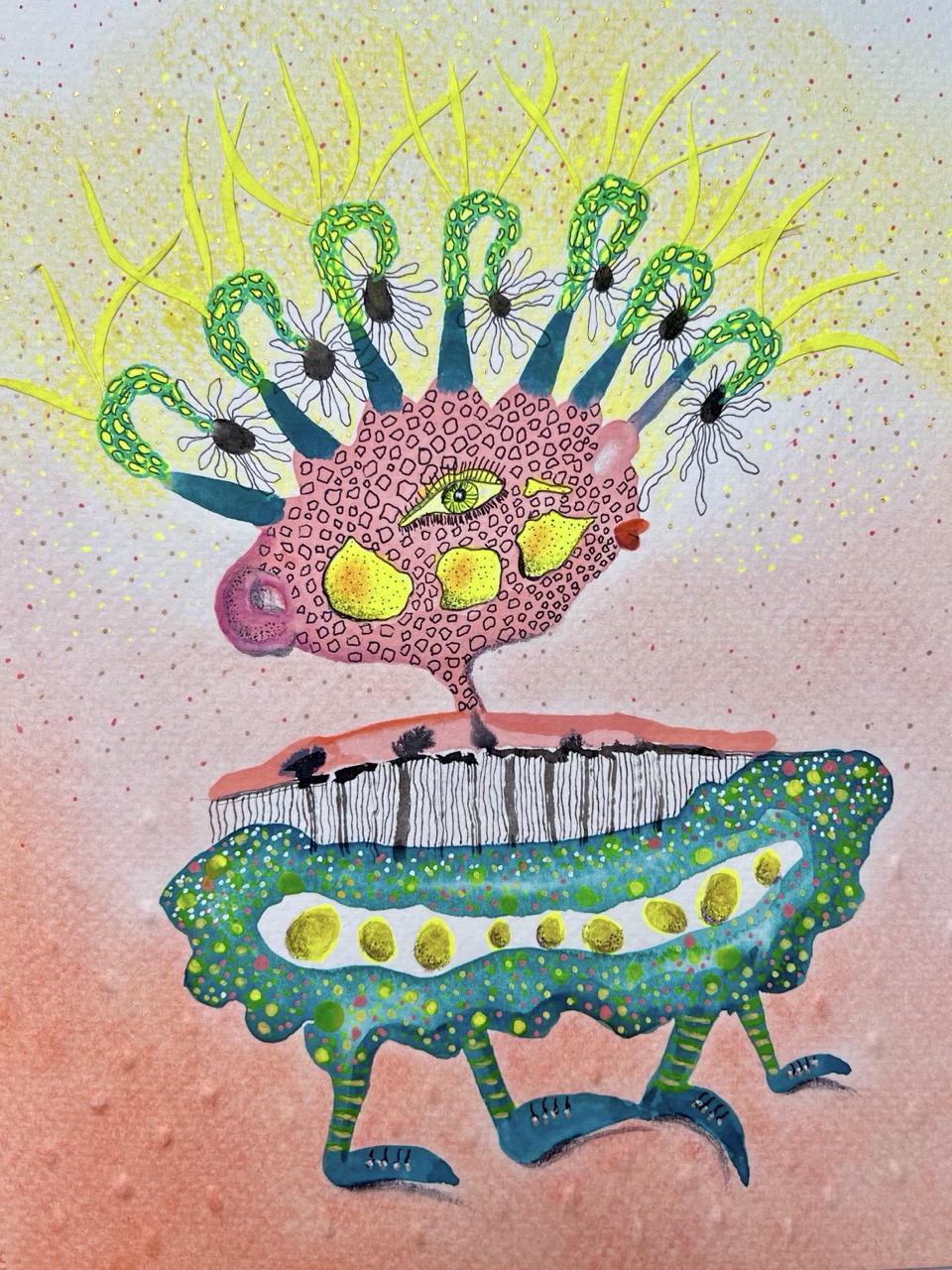Gemengde techniek, o.a. aquarel, inkt, kleurpotlood, pastel, collage