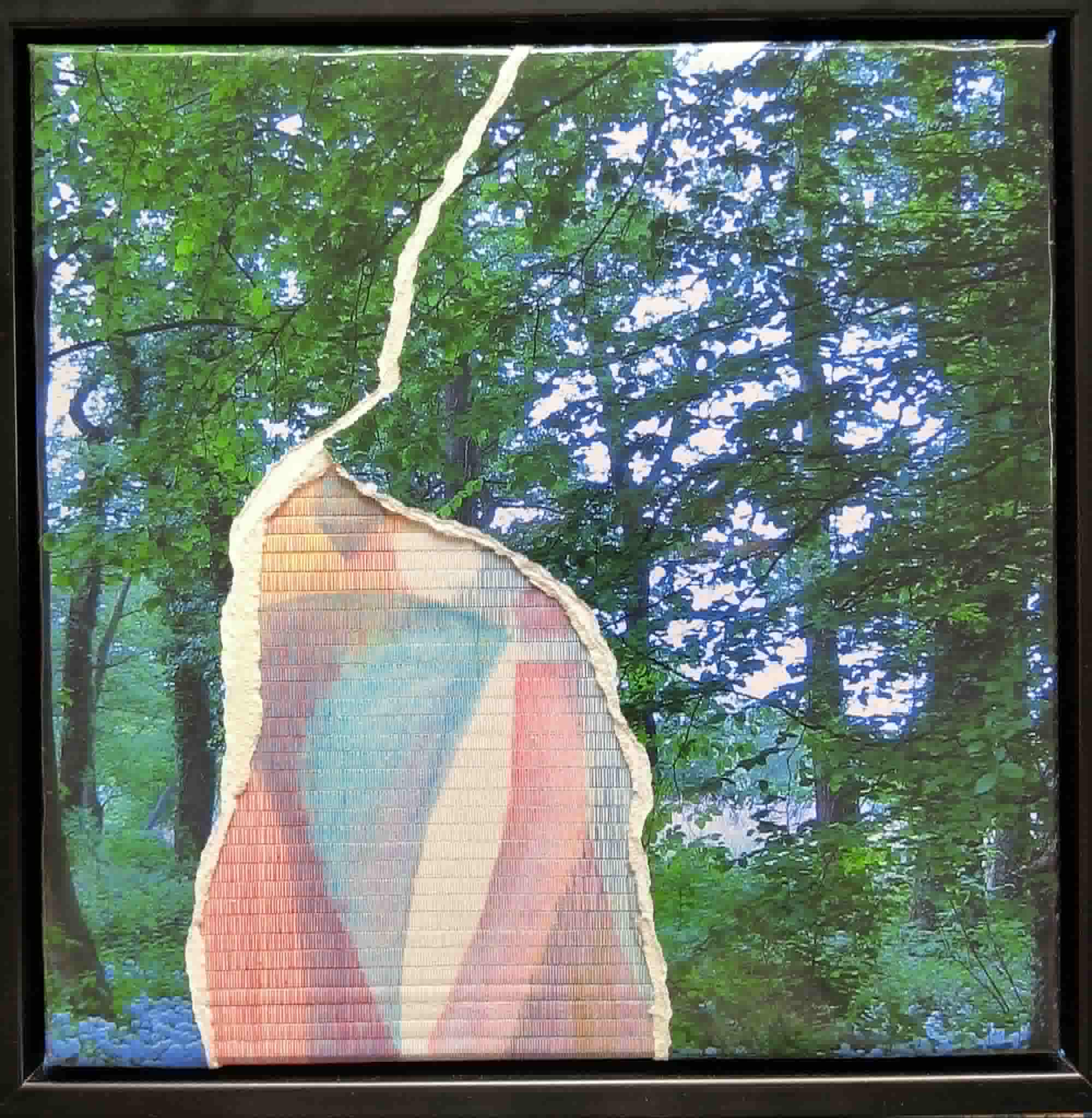 waterverf op papier, geweven in katoenen naaigaren. passepartout van gescheurde foto