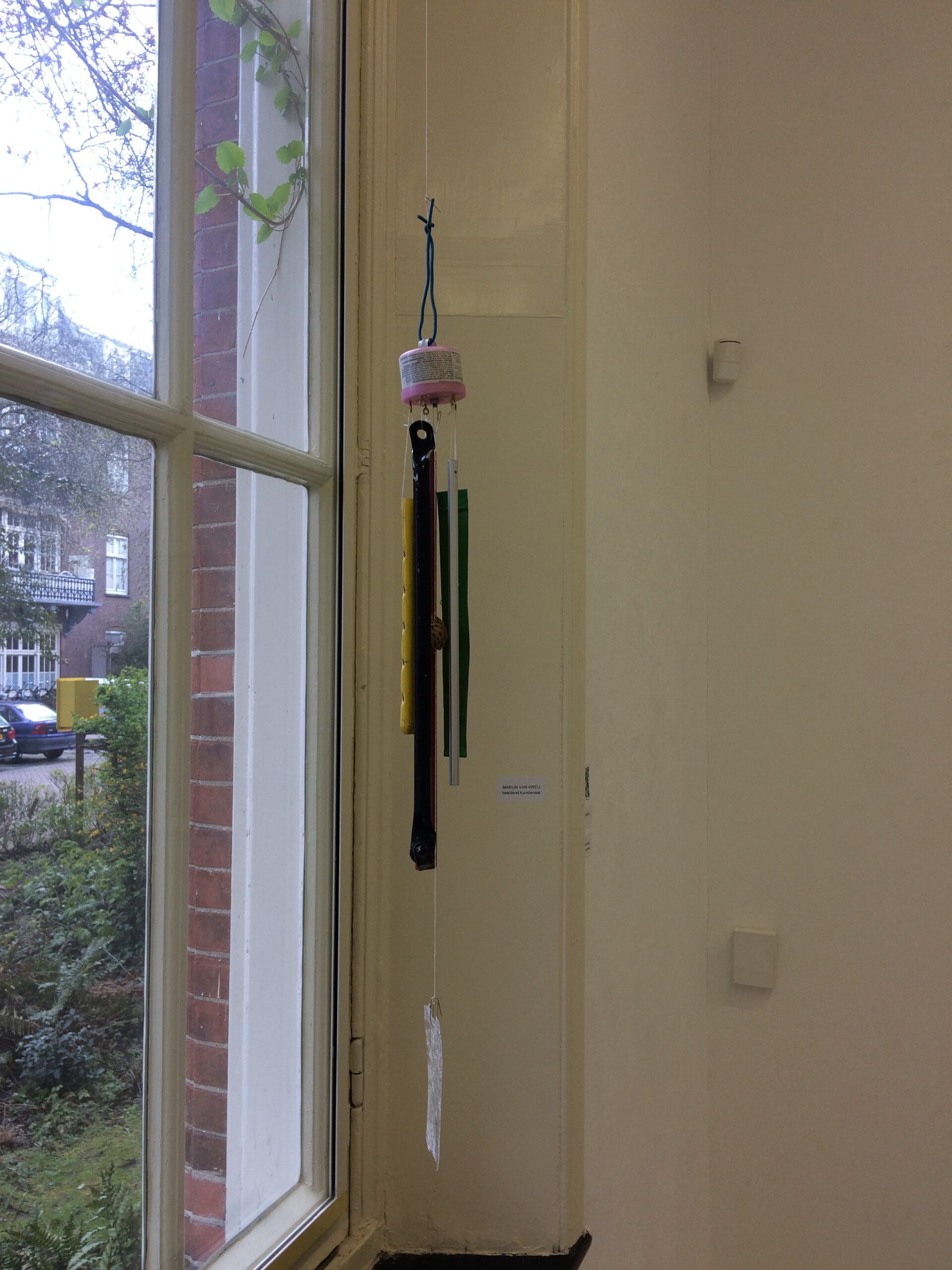 In een hoek verderop zie ik een soort gong hangen. Een werk van Marijn van Kreij. Zo te zien zelfgemaakt, van gevonden stukken gekleurd metaal. Het gedicht van Maria Barnas spreekt over plotselinge veranderingen in hoe de wereld zich aan ons voordoet en over de onzekerheid en angst die dat met zich mee brengt. Over het donker dat de werkelijke aard der dingen verbergt. Maar valt er licht op dan ontglipt juist datgene wat we zoeken. Als de gong slaat lijkt er regelmaat te ontstaan in de wisseling van zien naar niet zien, van gevoel naar gevoelloos. Een bezwering van het onheil, een boodschap van oosterse wijsheid. Het ritme van de gong reguleert onze angst en onrust.