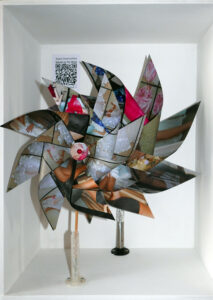 NATALJA IN THE WIND is een serie groot formaat papier windmolentjes. Het zijn kinetische mobiles die draaien met de wind mee. De werken zijn volledig gerecycled uit de ongebruikte pagina’s uit een eerdere kunstenaarsboek LINGERIE QUEEN. Verder bestaat het werk uit oude penselen, kurk, en antieke pinnen. De werken zijn 3D unica, en komen in diverse formaten. Het oorspronkelijke boekproject duurde 6 jaar. Als een detective volgde Zwierzynska via Internet de Amerikaanse NATALJA – een lingerie verkoopster op eBay. Natalja’s handelskenmerk was zelf sensueel te poseren in haar huiskamer in de lingerie die ze verkoopt. Het boek is een verzameling van 22000 pikante foto’s van Natalja, gedownload van haar verkoopsite. Het boek was vorig jaar te zien bij Galerie de Schans. DOUCHEGORDIJN NATALJA was vorig jaar tentoongesteld bij WG Kunst. Zie ook artikel in de Volkskrant https://agata.home.xs4all.nl/press_volkskrant.html